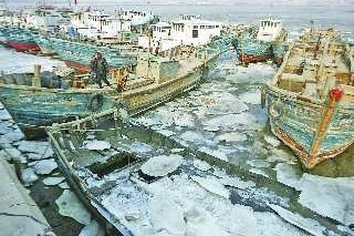 5日上午,在胶州湾红岛渔港码头,阳光晒化最后几块外港上面的浮冰,十几条小渔船被拖上岸来维修。“前几天海冰把外港的海水都给冻住了,船身木头都划坏了,现在趁着天气稍微暖和点赶快修船”,外港码头上正在维修船只的程师傅说,去年因为海冰灾害,码头几十条渔船船身都有损坏,这些损失都是自己负担,今年大家格外注意海冰,不出海的渔船已经提前上岸避冰了。 在距离外港仅百米的内港码头,由于背着日光,二十几条大小渔船牢牢地冻在了冰上。鲁城北渔2693号的渔民赵师傅告诉记者,海水结冰了,渔船出不了港湾。听说过几天还有一股冷空气来袭,他担心海水结冰的面积会越来越大。他说,100马力的木头船,保险公司才给保险,小渔船根本不给投保。 国家海洋局北海预报中心5日预报显示,胶州湾浮冰范围1海里左右。近期受频繁冷空气影响,胶州湾海域冰情发展较快,特别是水产养殖区、港口码头等海域可能出现严重冰情。胶州湾未来3天海冰最大外缘线达到0.8到1.5海里,一般冰厚3—6厘米,最大厚度达到10厘米,均比3日有所发展。 赵师傅说,码头内港最近二十多年来很少大面积结冰,往年遇到寒冷天气只是有层薄冰。但是去年和今年,海冰厚度达到了七八厘米,渔船全都冻住了,渔港也封住了,避风港成了冰封港。