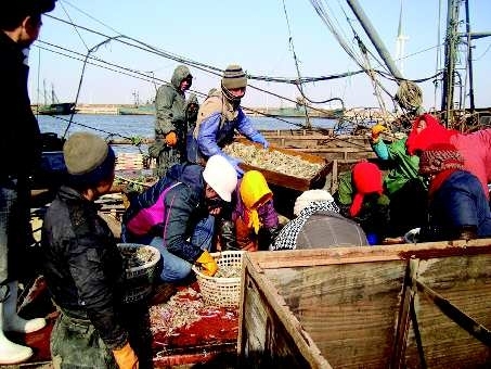 5日中午12点,羊口中心渔港几艘渔船上的渔民正在卸海货。去年12月29日起,受持续冷空气影响,羊口中心渔港港区及航道大面积结冰,渔船出海生产后无法归港。4日起,潍坊气温有所回升,目前羊口中心渔港冰冻大面积消融,只有少量浮冰,渔船基本可以顺利通航。