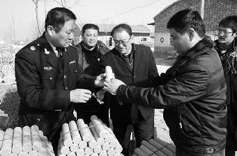 春节临近,烟花爆竹也进入销售旺季。近日,乐陵市安监局对辖区烟花爆竹生产单位开展安全检查。图为监察人员检查汇东花炮有限公司的爆竹原材料。 本报通讯员 战建荣 邢超 摄