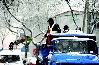 5日,烟台市区再次迎来降雪。为了减轻降雪对城市交通的影响,市政养管处工作人员冒雪上街抛撒防滑沙和融雪剂。 本报记者 赵金阳 摄