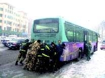 司机正在发愁时,附近扫雪的消防官兵主动上前帮忙,一边疏导过往车辆,一边将车辆推往路边。经过10几分钟的努力,公交车成功靠到路边。