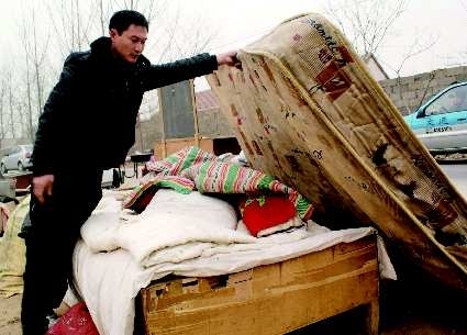 5日下午14时许,记者来到河东区太平街道办事处徐太平村。村西头的一片空地上,摆放着一堆锅碗瓢盆、床铺和衣橱等物品,煤气灶、洗衣机等家用电器,横七竖八地放在马路两旁。徐宝华的妻子刘英正从包袱里挑选干净的衣服,给孩子穿上。