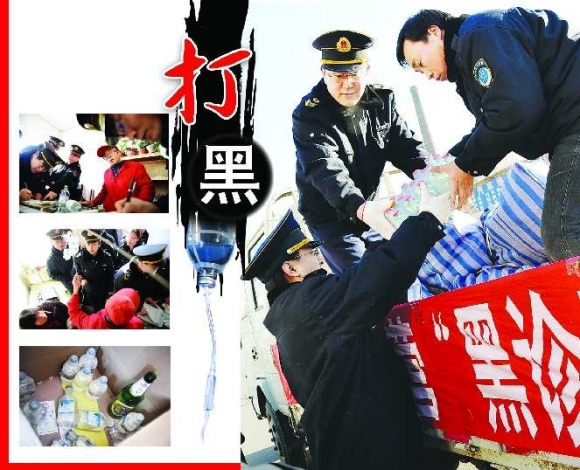 输液瓶竟与啤酒瓶堆在一起。“黑诊所”正在给患者输液。对“黑诊所”进行“搬家底”剿灭。