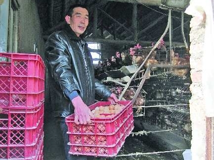 ▲仲宫镇钱家村的蛋鸡养殖大户薛桂红正在从鸡厂里往外搬成筐的鸡蛋。 本报记者 殷亚楠 摄