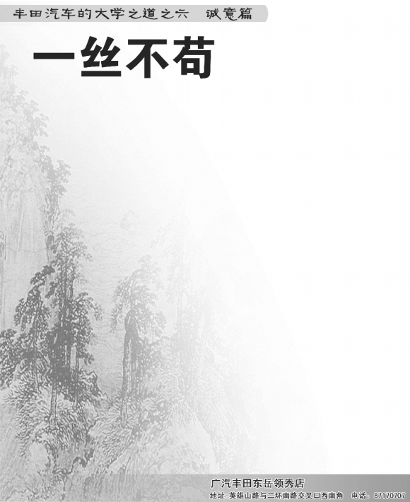 丰田汽车以其享誉全球的丰田品质备受各国人民的信赖与喜爱。这归功于丰田“顾客至上”的理念和由此形成的在开发、生产、销售及服务各领域中的综合实力。在从研发到生产到销售到售后服务的每一个环节,无不浸透着丰田汽车“做最好的车给消费者”的生产理念。先是研发阶段的数据调查监测,到车辆理论数据性能确认和现地适应性评价,再到品质保证部门的零部件和整车监查性评价及生产环节的工序内全数监测和整车行驶监查,最终在售后服务部门的故障诊断及维修支援,最终是使用过程中的不良现象再调查,无不体现出丰田“品质高于一切”的造车理念,暗合了“做正确的事就是目的”的诚意之道。