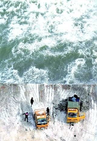 6日,在烟台滨海景区积雪入海处,海面上巨浪翻腾,与岸边正在倾倒积雪的工作人员相映成趣。