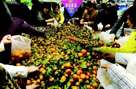 1月6日,烟台市一大型商场内顾客们争相选购特价沙糖桔。近日南方遭遇寒流袭击,导致产区柑橘价格骤升,该商家却