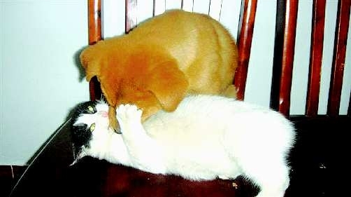 作品描述:温柔的小猫面对狗哥哥,羞答答地说,别亲我。