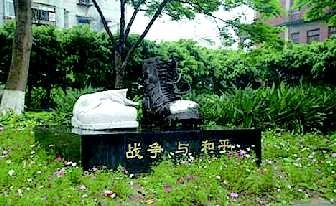 作品描述:这组雕塑既简单又不起眼,低矮的台座上并排放着一只白皮鞋和一只黑皮靴。这两只鞋黑白分明,用途迥异。雕塑寓意深刻:“千里之行,始于足下”,从同一个出发点出发,最后到达截然相反的目的地。雕塑以简洁明快的手法,表达了人民热爱和平,厌恶战争的朴素情感。