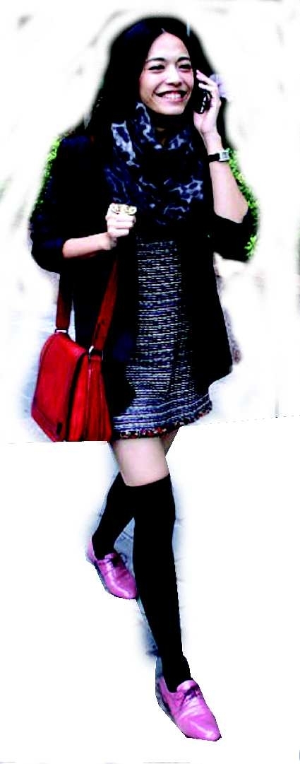3、姚晨搭配灵感:一直很喜欢英伦学院风浓郁的造型,这身搭配中的翻盖包和牛津鞋也是特别为这样的风格准备的。也许有些人会说过膝袜会不会太过粉嫩了,趁着还有青春的资本要赶紧啊。