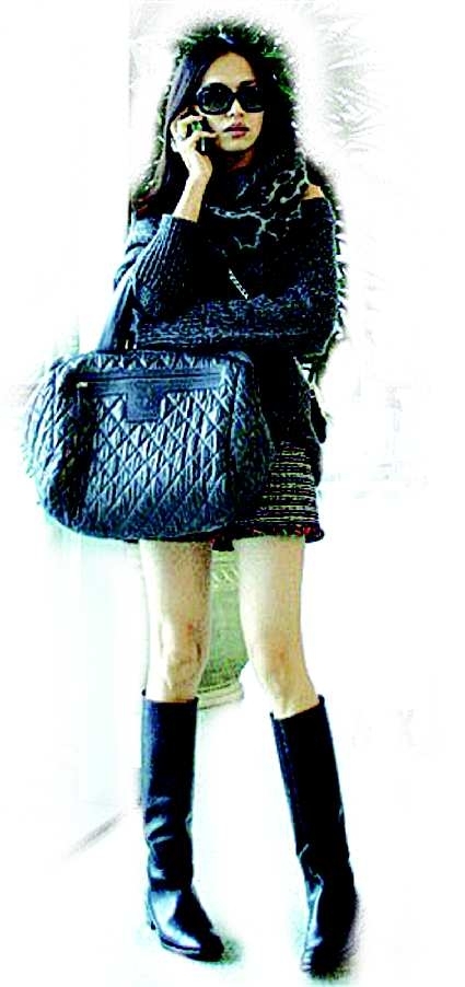 2、姚晨搭配灵感:搭飞机的时候,舒服自然是最重要的了。针织毛衣和平底长靴都是简单又好穿的单品,当然一个轻松又大容量的挎包也是旅途不能缺少的。