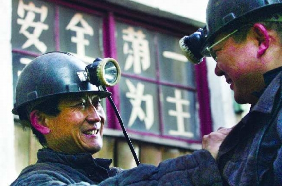 两个矿工好兄弟在带有“安全第一”的矿区标识下拥抱离别,他们的脸上写满了不舍。