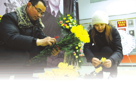 6日晚上9点30分,记者再次赶到灵堂布置点看到,三名殉职英雄的遗像高挂在灵堂上方,花圈已经摆满了灵堂两侧,泰安市六个县市区公安局送来了花圈。工作人员正默默地书写挽联,紧急调拨的2000枝菊花经修剪后做成花篮,摆放在灵堂中。