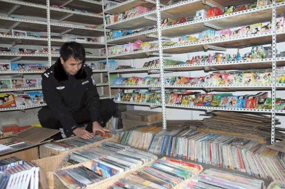 6日上午,在市区香江光彩大市场,聊城警方端掉一个贩卖盗版音像制品的窝点,当场查获了几屋子的盗版光碟和磁带。