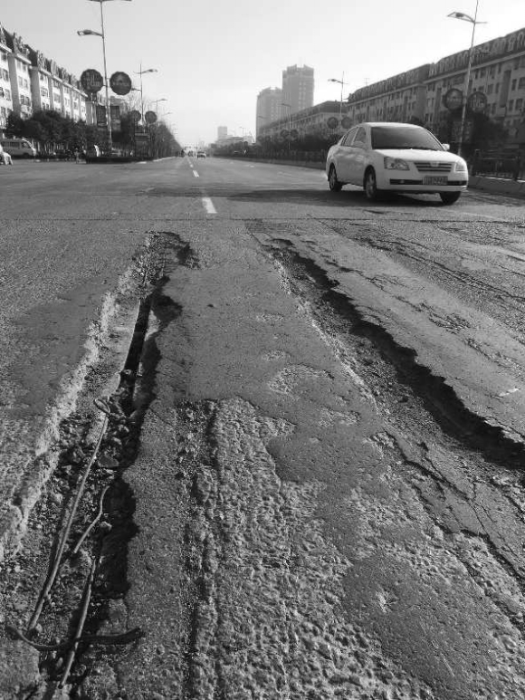 6日,振兴路聊城第三加油站附近,8米多宽的机动车道上布满车痕,两条长约6米,宽约20厘米,路面下已露出钢筋石板。附近一位市民说,路面坏了已有两三个月了。 见习记者 李璇 摄