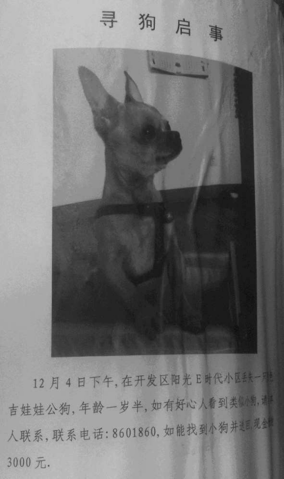 6日上午,在东昌东路阳光E时代小区附近电线杆上,一张《寻狗启事》(如右图)上写着,去年12月4日下午,在开发区阳光E时代小区内,一只棕色吉娃娃公狗丢失,如果有人找到小狗并送回,将送上现金3000元表示感谢,并附有联系方式。记者随后按照上面的联系方式打了过去,得知贴启事悬赏寻宠物的并非狗主人,而是宠物狗的原主人张女士。
