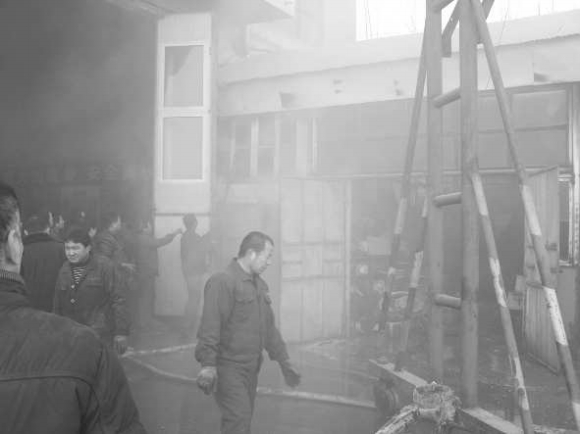 6日下午2点20分左右,记者赶到柳园路汽车总站北侧的凤凰客运公司大院内,院内西北角冒着浓烟,三辆消防车停在起火车间的南侧,十多名消防队员和汽修厂的工人,一起捣毁车间的玻璃,放出里面的浓烟。20多个烧毁的废旧轮胎扔在消防车附近。与这个车间相连的另一个十几米高的车间内也弥漫着浓烟,里面停放的两辆客车没有烧到。