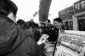 1月5日上午,日照交警岚山大队联合区文明办在岚山头街道海州路市场举行“送平安,送祝福”交通安全宣传活动。现场向群众发放印有交通安全知识的购物袋、“福”字等宣传材料3000余份。 通讯员 赵庆竹 摄