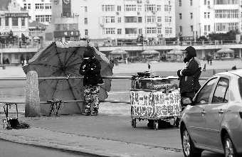 6日,在栈桥附近拍照的市民撑起遮阳伞避风。6日是小寒,岛城市区最低气温下降至零下6℃,本周末还将迎来一股冷空气,外出的市民要注意防寒保暖。 本报记者 杨宁 摄