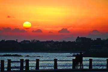 6日,适逢“小寒”,在海风凛冽的音乐广场,一对情侣依偎在一起听着起伏潮涌的海浪声,橘红的霞光燃烧了西天的云絮,跳动着灿烂光晕让人沉醉。 本报记者 张晓鹏 摄
