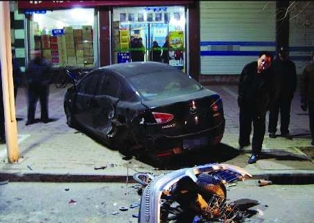 3日晚,在齐河县阳光路发生惊险—幕:—辆捷达轿车将—名骑电动车的女士挂住,竟然将受害者拖行1000余米,左右摇晃着甩掉受害人后,又连撞两车。图为车祸现场“受伤”的电动车和马自达汽车。 本报通讯员 刘波 本报记者 王金强 摄 详见C06版
