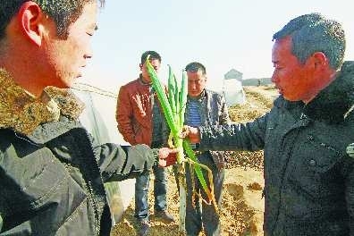 河南蔬菜批发商樊富贵(右一)到费县葱棚看货。