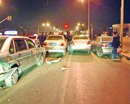 1月6日晚10点左右,在历山路板桥附近,一辆别克轿车连撞四辆出租车才停住,据出租司机说,他们当时在等红灯,别克司机可能喝了酒。文/本报记者 吴金彪片/读者 林先生