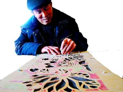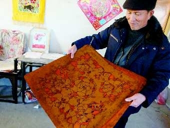 这是一幅“鱼穿莲”图,黑得发亮的版样上,顽皮的金鱼甩着尾巴穿梭在两朵莲花荷叶中。“看看这点,均匀不?”张明建眯着眼睛指给记者看,“点间距多细,也就一根头发丝吧?这就是老祖宗的手艺啊,多精细!”原来,这就是当年文革期间被张明建藏在鸡窝里才躲过了“红卫兵”扫荡的珍贵老版之一。