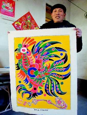 新作品。”他从里屋堆放的一卷卷花布中翻出一块染好的布。这是一只踩着如意腾空而起的雄鸡图案,寓意“吉祥如意”。雄鸡的主体颜色是红色,深红、大红、桃红三种颜色逐层由鸡身向鸡头渲染,明黄与深绿中和,让整幅图色彩更加鲜艳,5根尾羽用了5种不同的颜色来渲染。