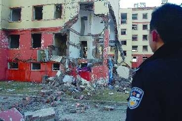 爆炸现场,居民楼的一层和二层坍塌。 本报记者