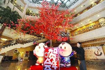 9日,山东新闻大厦一楼大厅内,雕刻师王师傅正布置新年的灯箱景观,中间一棵仿真桃树开满“桃花”,春意盎然,而旁边的贺年会吉祥物“福福”和“乐乐”以灯箱的形式亮丽出场。记者看到,济南大街小巷、各个单位都开始“梳妆打扮”迎新年。
