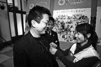 9日晚,在人民会堂,红十字会的志愿者正在给市民佩戴微尘徽章。当日,“微尘,爱的交响”微尘感动中国5周年暨2010年度答谢音乐会在人民会堂举行,本次活动由青岛市委宣传部、市文明办、青岛市红十字会、青岛红十字微尘基金共同主办。据了解,2010年微尘基金共募集912万元善款,共救助15万人次。本报记者 杨宁 摄