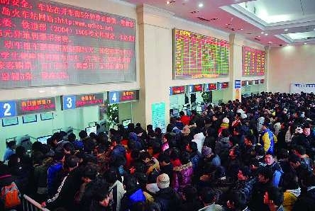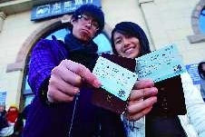 9日,在青岛火车站东售票厅,排队前来买票的市民“挤”在大厅内。当日下午3点起,春运首日的火车票全面开售,其中普通列车车票预售期为11天,学生持学生证可以买到12日以内的车票。当日,在青岛火车站售票厅门口,刚刚买到2011年1月20日车票的两名学生高兴地向记者展示手中的车票(小图)。 本报记者 张晓鹏 杨宁 摄