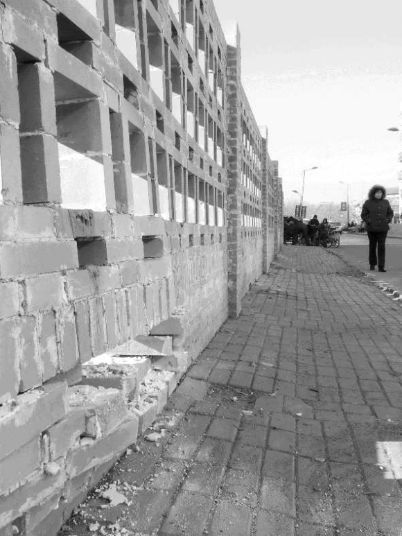 卫育任庄小区对面的小区停车场北墙有一处明显凸起,凸起部分中间有一个长半米、宽约30公分的洞,破洞周围的砖向外错出十公分,有的已经掉在地上,有的一半还卡在墙上。由于墙体上方是花砖镂空搭建,撞坏的墙体已出现裂痕。附近小区的一位居民说,墙是前两天被停车场里的车撞的。由于这面墙紧靠马路,不少路过市民担心被砸伤。附近一位带孩子的女士说:“砖都撞得错位了,不知道会不会塌?我天天在这过,以后可得躲远点。”