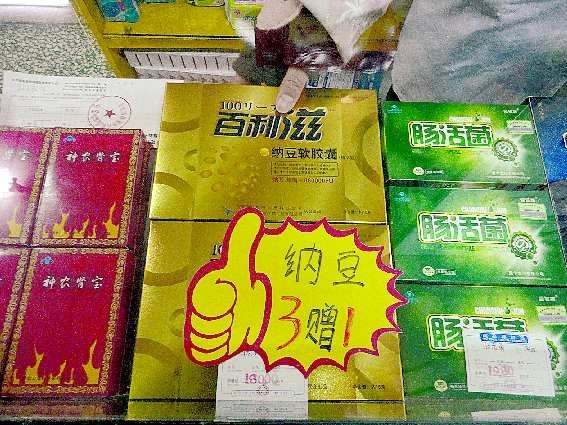 6日,烟台北马路上的某药房,百利滋纳豆软胶囊售价为每盒180元,并有买三赠一的活动。营业员向记者介绍:百利滋纳豆软胶囊每盒的含量为60粒,食用方法为每日两次,每次2粒,温开水送服。