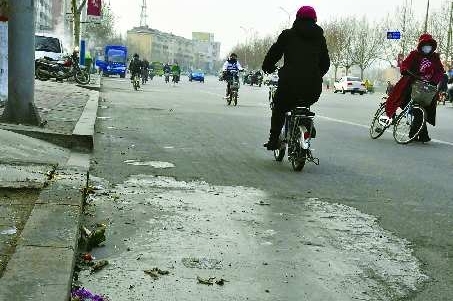 7日,德州东风西路上一家临街店面前,泔水倾倒在公路上结为大片冰面,过往行人纷纷避让,带来交通隐患。 本报记者 苏超 摄