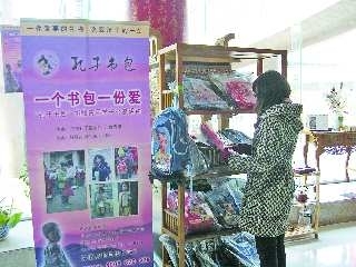10日,在济南“孔子书包”认捐现场,一位市民正在挑选认捐的“孔子书包”。 见习记者 王若松 摄
