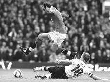 曼联队球员贝尔巴托夫(上)与利物浦队球员库伊特拼抢。