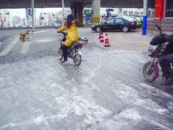 10日上午,记者在山大南路和二环东路交叉口看到,整个路面已经被厚厚的冰层覆盖,宽处至少有四五米,覆盖了小半个机动车道和整个辅道。“已经有一个星期了,不知摔了多少人了!白天还好一些,晚上刹不住车,电动车从辅道上走,经常是连人带车摔在地上。”二环东路3989号院内的居民纪女士告诉记者。“刚才还有一个小学生不小心摔倒了。”旁边一白酒商店的工作人员说。