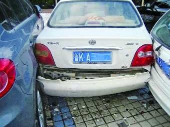6日,在高区金海湾大酒店门前,一辆别克车停车时由于只把手刹拉到一半,导致车向后滑动,连撞三车后才停下来,造成四车损坏。图为事故现场。