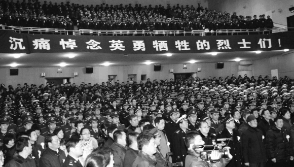 简短而庄重的追悼会结束后,很多人站在原地,望着主席台上四位烈士的遗像久久不愿离去。一位女士因为过度伤心,竟差点栽倒在走廊上。