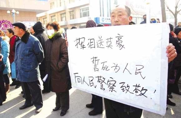 10日上午9点左右,四位烈士追悼大会还没开始,在泰山影剧院门口,一位男子双手举着一块白板,板上写着“挥泪送英豪,誓死为人民,向人民警察致敬”几个大字。记者发现,这名不愿透露姓名的男子前几天曾在四位烈士的公祭灵堂前跪地叩拜。