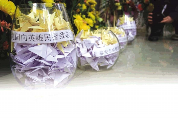 10日上午,在泰安革命烈士陵园的追悼会分会场,泰安奥林匹克花园小学卓雅幼儿园的6名幼儿园老师来到现场。当4位手捧着装满千纸鹤瓶子的老师站立在直播追悼大会现场的大屏幕前时,很多双满是泪水的眼睛齐刷刷地望向他们。这4位老师每人手捧着一个透明玻璃瓶,里面装满了黄色的、白色的纸鹤,一共1000只。瓶子外侧还用白纸黑字贴着“向英雄民警致敬!”字样,送千纸鹤的老师们说,她们相信千纸鹤能承载着她们的祝愿和希望。