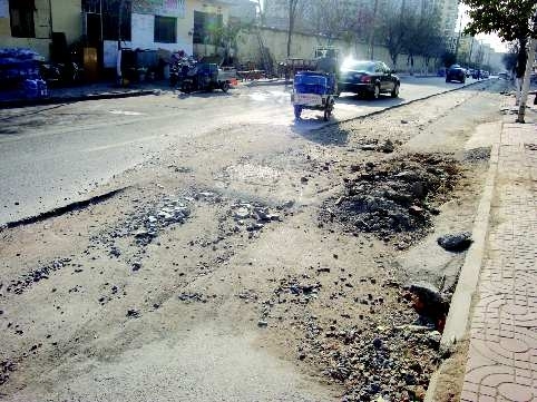 1月10日10时左右,王先生通过本报热线反映,他每天上下班开车经过这段路都要颠簸一番,路面坑坑洼洼已经存在一个多月了(上图)。家住附近的刘女士说:“暖气管道铺好好长时间了,路面却一直没有修,我们每天出行很不方便。”