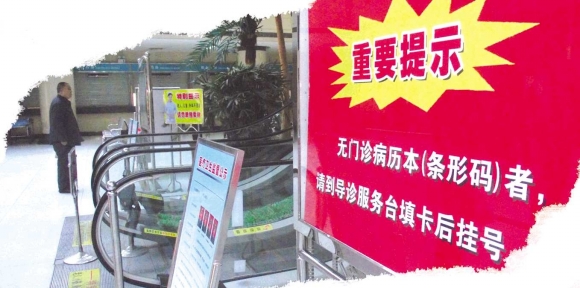 7日,记者在泰安市中心医院看到,医院一楼大厅有一个醒目的提醒展板。展板上写着:“无门诊病历本(条形码)者,请到导诊服务台填卡后挂号”的字样。记者得知,泰安市中心医院已经开始实行“电子病历”,患者依据电子病历挂号看病。导诊台工作人员关芳向记者介绍,有了“电子病历”,医生可以在电脑上调出患者的病历,患者病史就一目了然了。