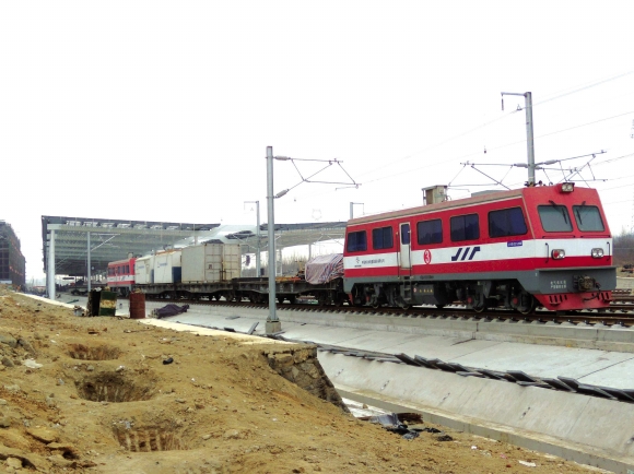 在已经铺完的轨道上,一辆火车机车安静地停在高大的雨篷下。工人马先生告诉记者,前几天高铁试车时,为保证安全,整条道路每隔20多米就有一个值班民警负责安全,机车快速通过,扬起的粉尘铺天盖地。