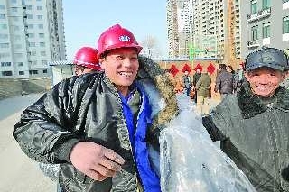 13日,在济打工的王宪好高高兴兴地试穿刚发的新棉衣。当天,在农民工即将返乡与家人团聚之际,济南慈善总会在济南市旧城改造安置房建设现场指挥部,举行“情系农民工温暖过大年”救助物品发放仪式,为农民工送上棉衣、毛衣、熟食等物品,感谢他们为建设第二故乡做出的贡献。 本报记者 张中 摄