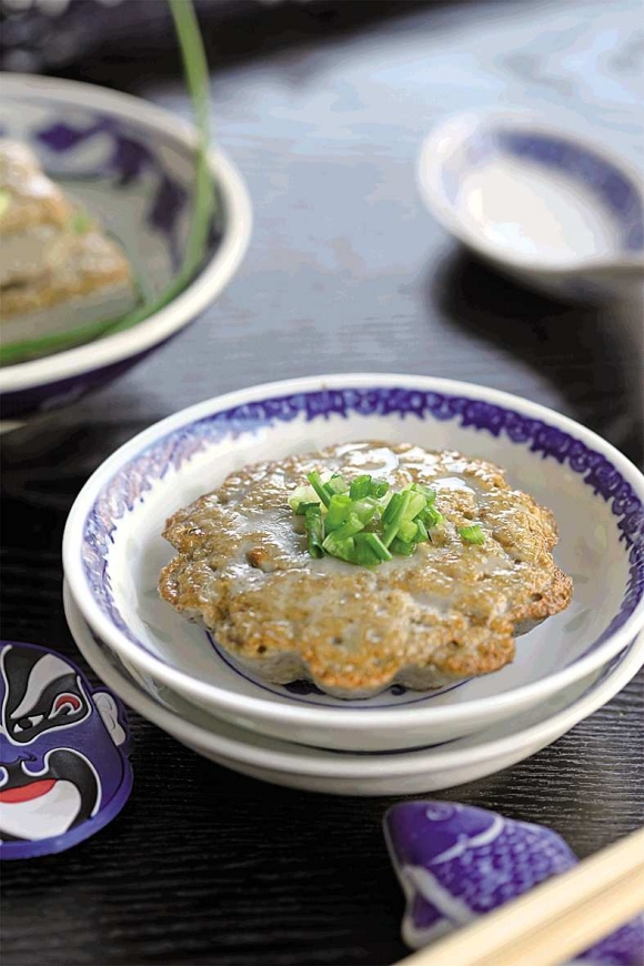 蛋、把做好的黑豆腐切成厚片拌证根蛋根统cm斛,不粘锅烧热,下花生油适量,把黑豆腐煎成两面金黄,用豉油调味,撒入少许葱花即可。