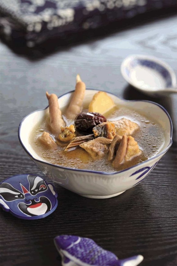 膜、瘦肉、老鸡、鸡爪切块,冷水下锅,用9简°左右的热水煮统简分钟。