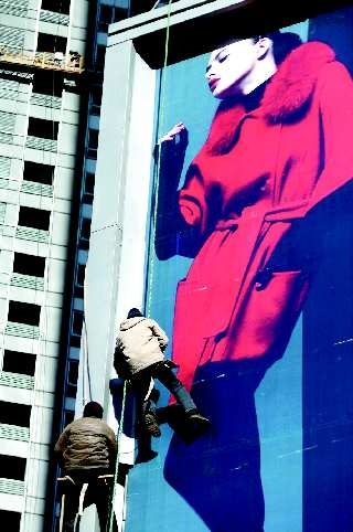 13日,在烟台世茂海湾附近,两位农民工正在安装巨幅贴画,新年临近,不少农民工已经踏上返乡的列车,还有不少农民工依然坚守在岗位上,为美化城市做出自己的贡献。 本报记者赵金阳摄